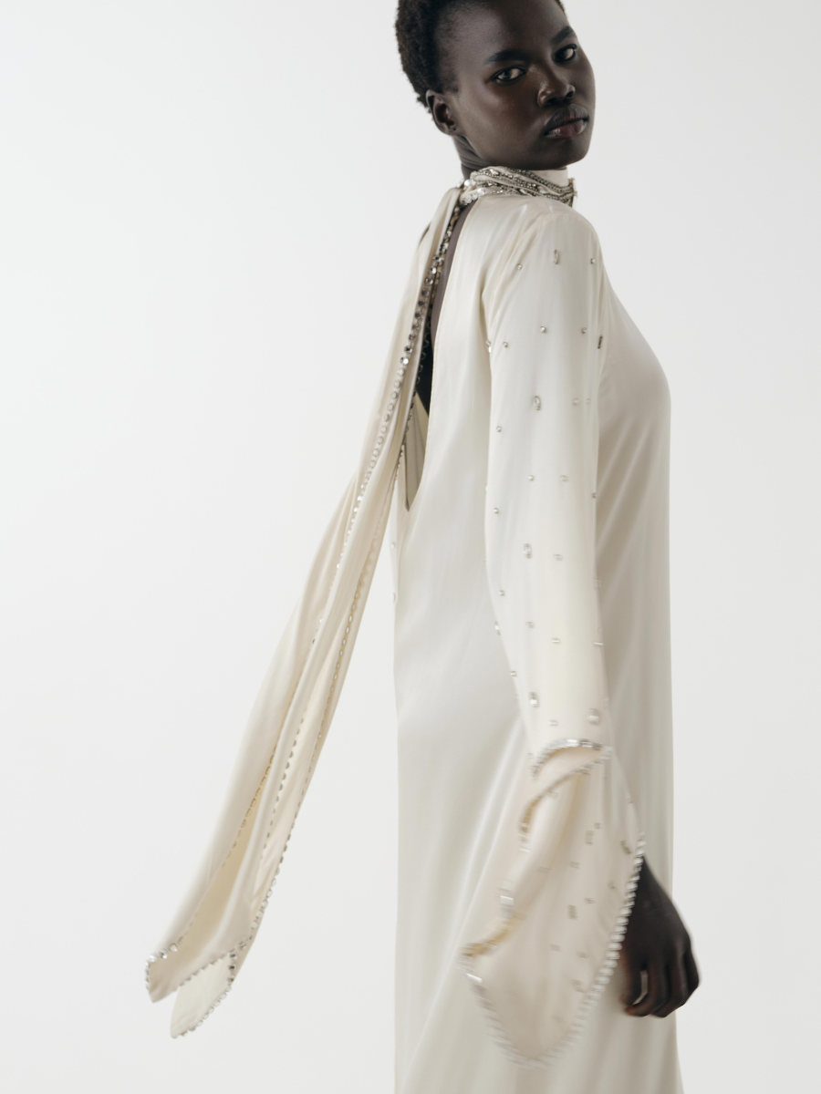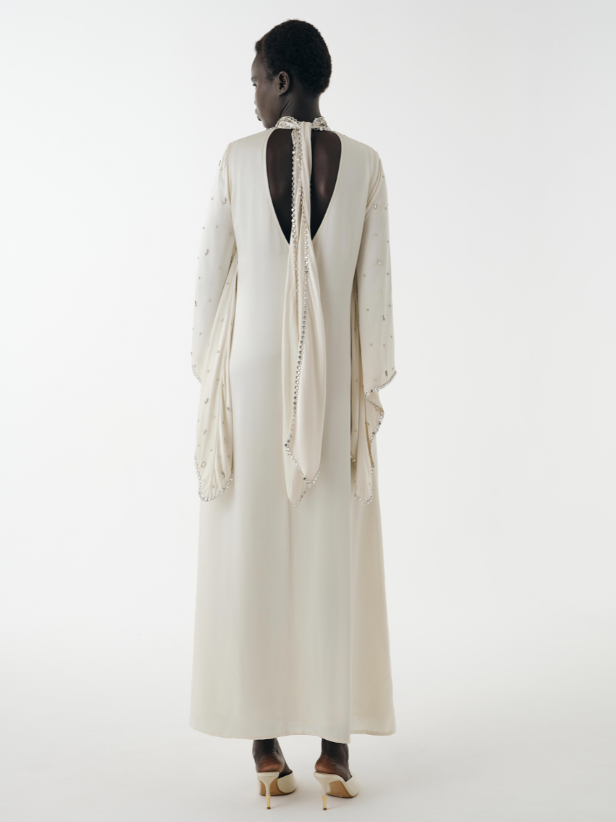 A delicate trail of hand-beaded crystal stones frames the neckline and finishes the tie details, catching the light with a subtle shimmer rather than a shout. Finished with softly flared bell sleeves, this white iteration brings a romantic, modern ease—perfect for elevated daytime occasions, intimate dinners, and elegant evenings that stretch late.