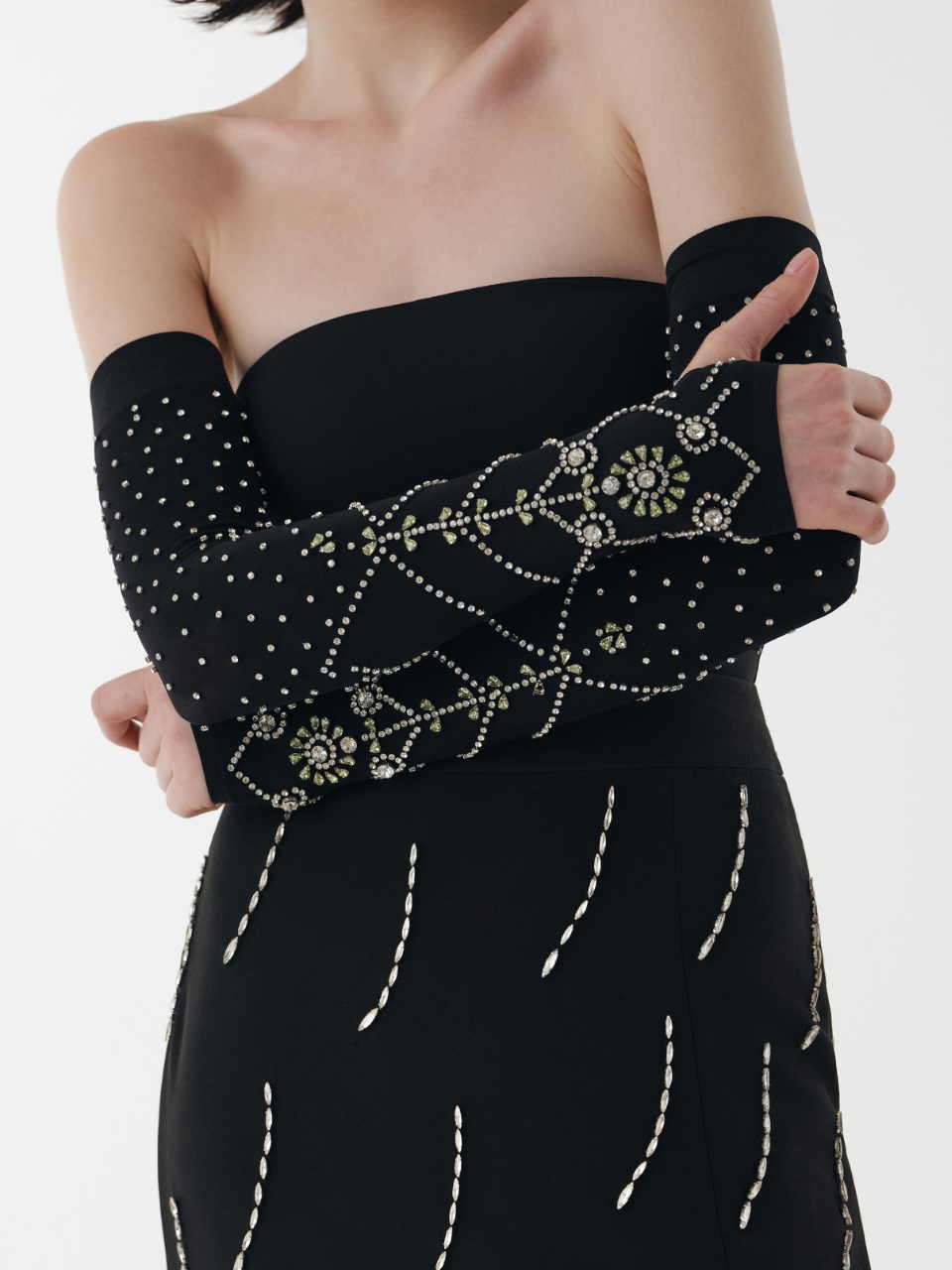 Bold, elegant, and exquisitely detailed, the ASHAALIA Hand-Beaded Fingerless Gloves are designed to add instant glamour to any outfit. Meticulously handcrafted by master artisans, each glove features intricate hand-beaded embellishments that shimmer with movement, making them the ultimate finishing touch for modern evening dressing.