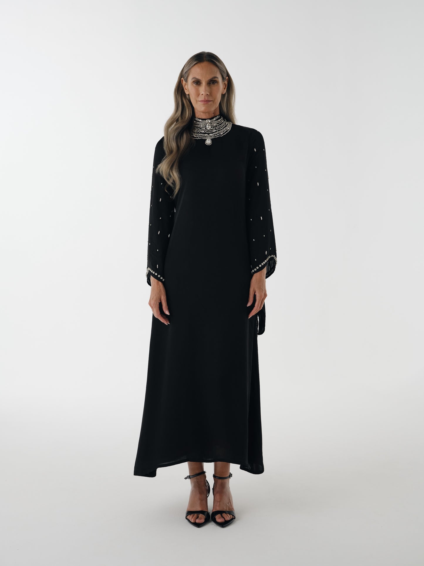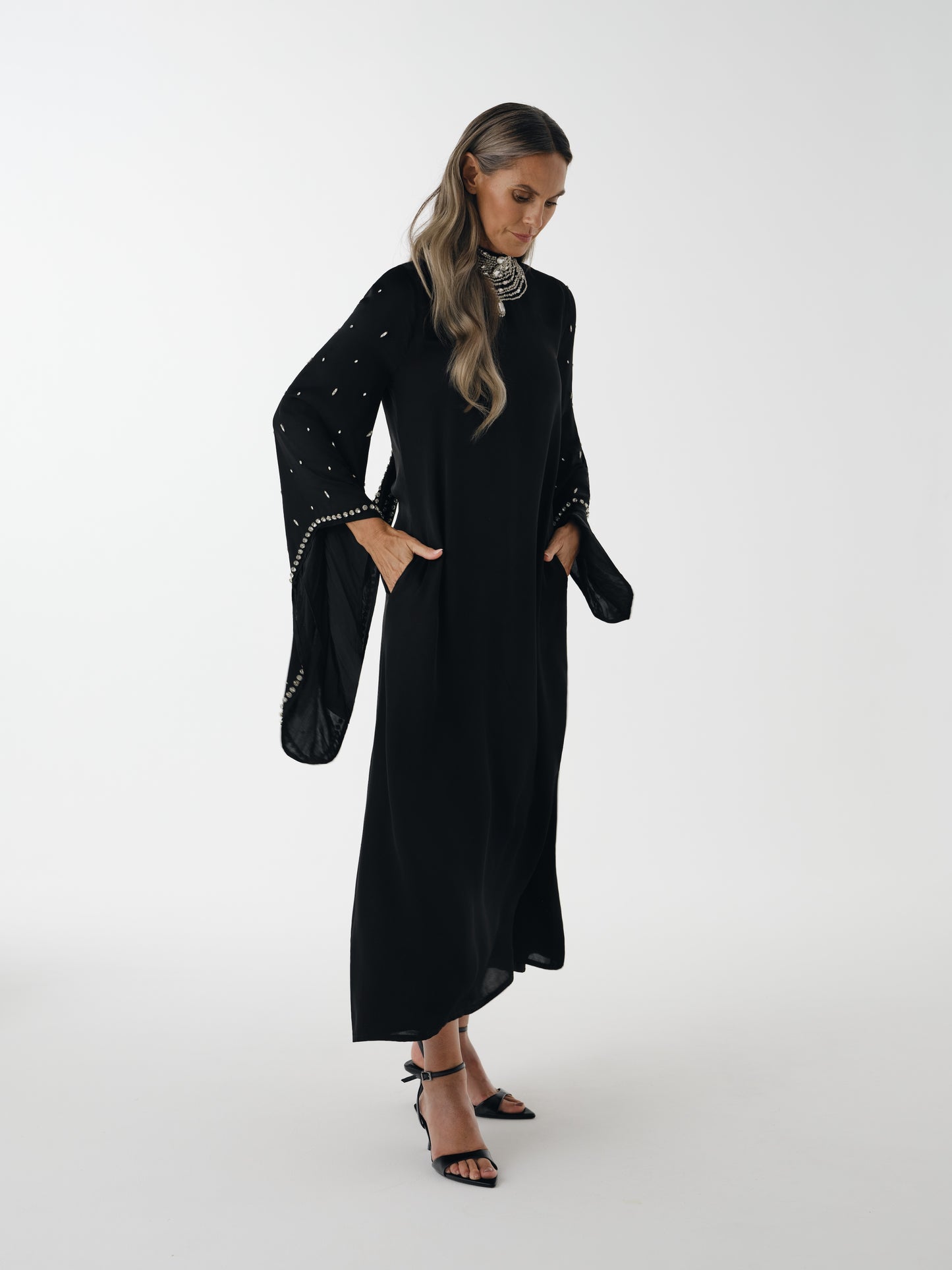 ASHAALIA Beaded Bell Sleeve Dress in Black.
