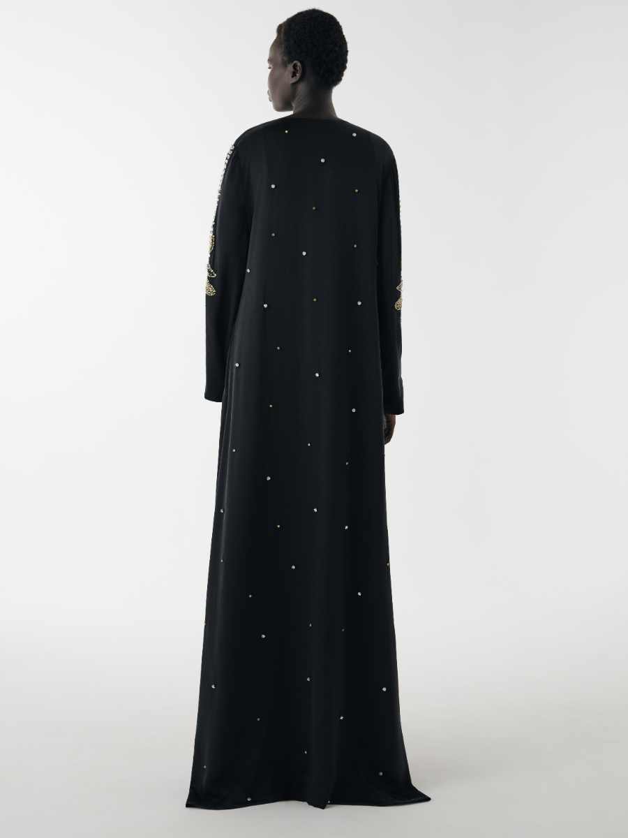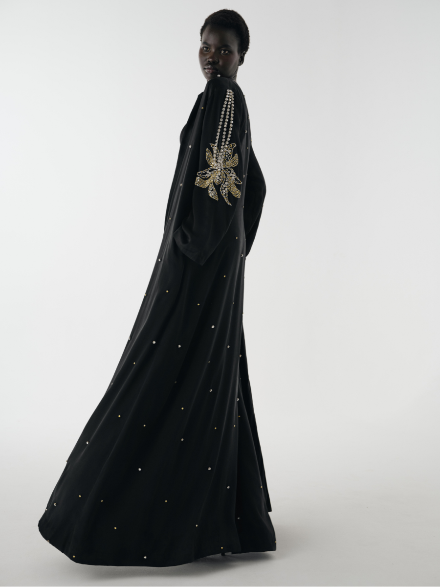 The Nargis Beaded Abaya is styled with our Sitara Reversible Silk Slip Dress - Onyx Black