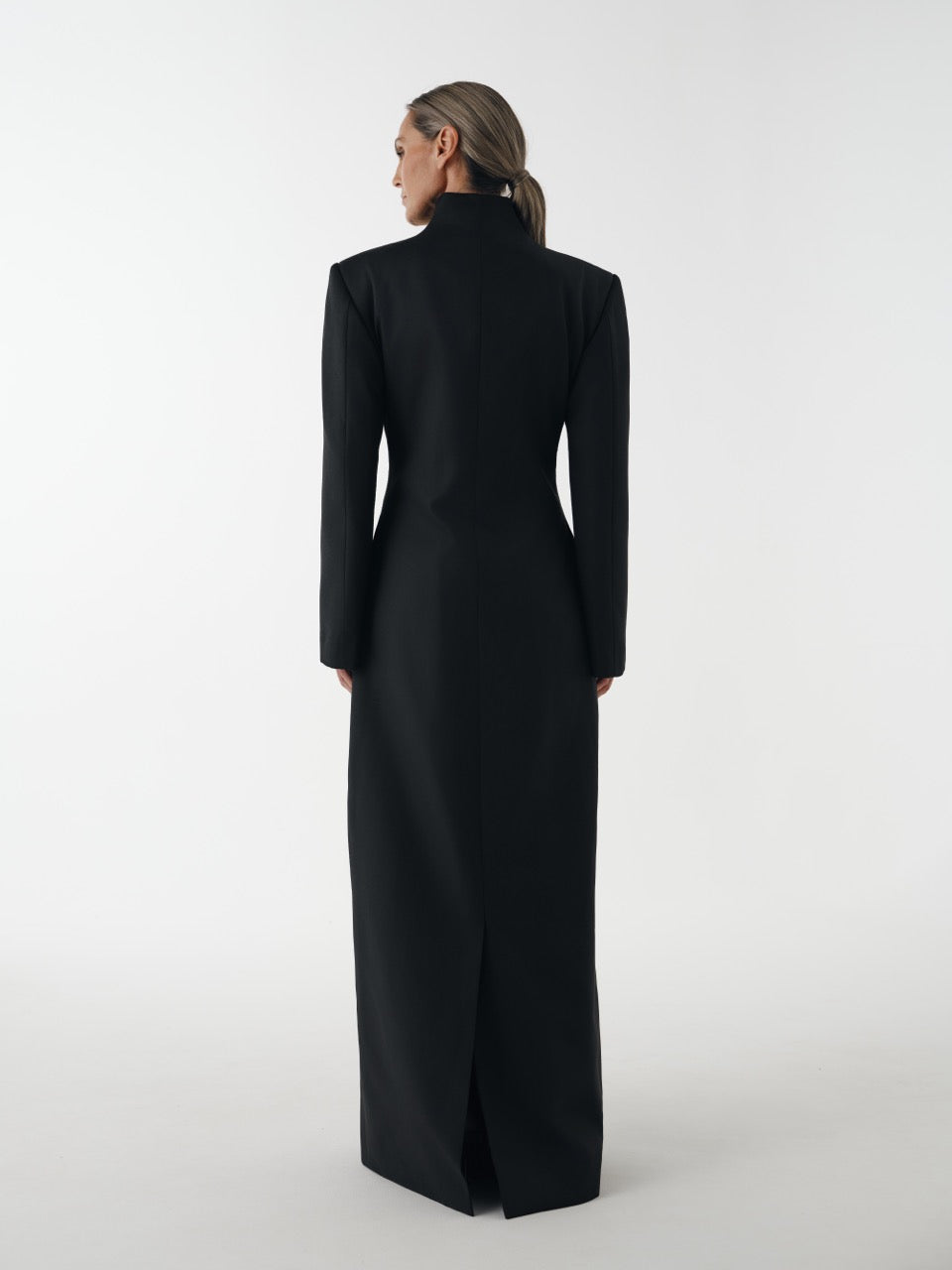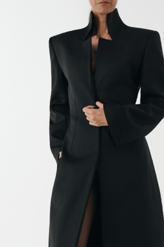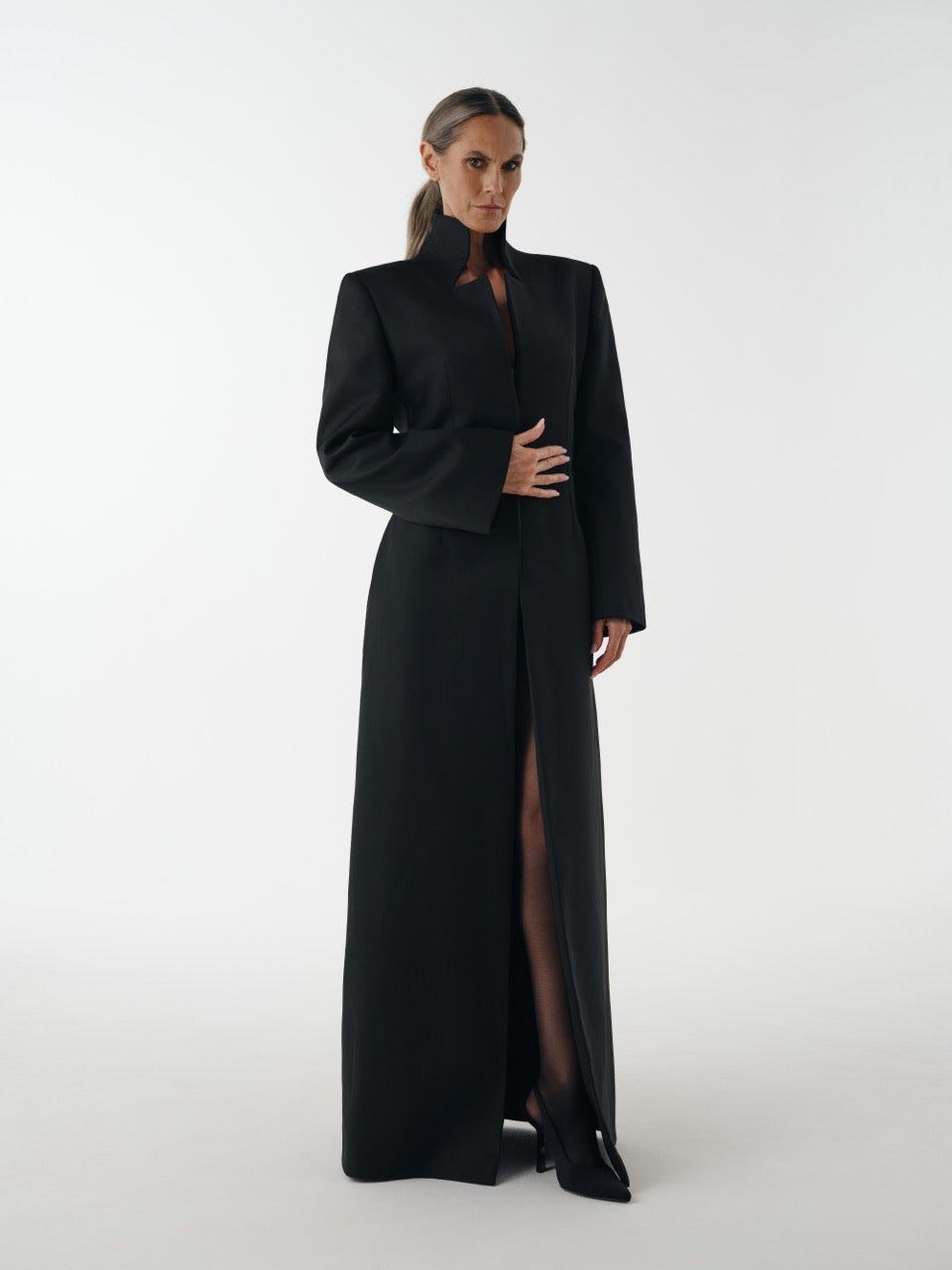 Make a powerful entrance in the Memsaab Coat, a full-length statement piece designed for the woman who leads with quiet strength and undeniable presence. Fully lined in luxurious silk, this sculptural coat features strong, structured shoulders and a dramatic high collar, combining traditional craftsmanship with contemporary edge.